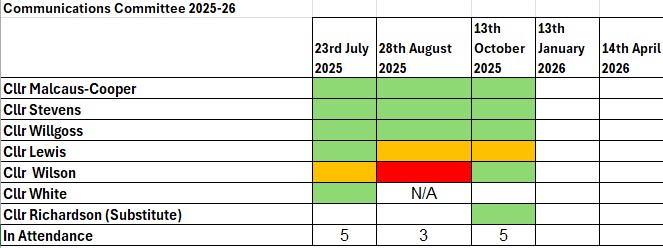 Chair of Communications Committee 2025-2026: Cllr Malcaus-Cooper. Vice Chair: Cllr Stevens